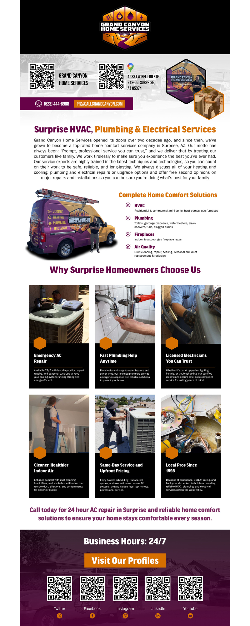 Comfort problems don’t keep business hours, and neither should your home’s solution. That’s why families call Grand Canyon Home Services for responsive HVAC and plumbing care that keeps daily life on track. Serving Surprise, Arizona, our residential specialists repair and maintain central AC systems, efficient mini-splits, heat pumps, and gas furnace equipment with thoughtful diagnostics and tidy workmanship. If cooling fails after dark, remember 24 hour ac repair surprise for rapid troubleshooting and reliable results. We also elevate indoor air quality with duct cleaning, duct repair, duct sealing, Aeroseal applications, and full duct replacement or redesign to balance airflow room to room. Around the house, our plumbers fix clogged drains, quiet noisy garbage disposals, replace water heaters, and handle leaky sinks, toilets, showers, and bathtubs. When evenings get cool, we service gas fireplaces—indoors and outdoors—to spark safe, steady warmth. Whether it’s a seasonal tune-up or an urgent fix, count on clear communication, upfront options, and craftsmanship built for desert living.